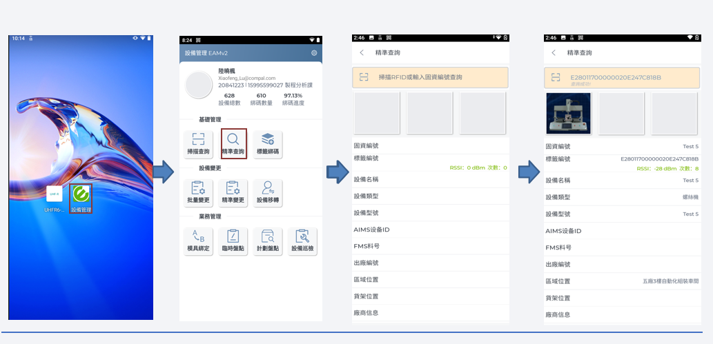 App端可標(biāo)記設(shè)備或治具當(dāng)前狀態(tài)(注冊,測試,生產(chǎn),閑置,報廢,移轉(zhuǎn),維修,保養(yǎng))